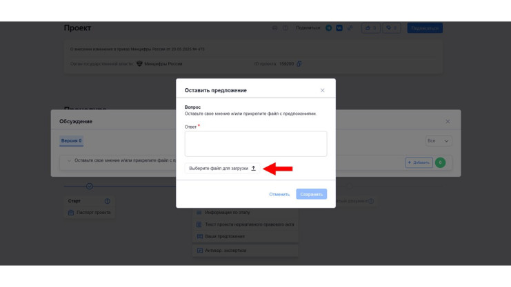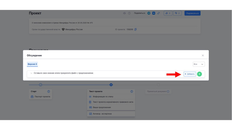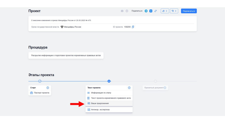 После этого нужно проверить статус проекта нормативного правового акта и возможность оставления предложений: как правило, проекты выносятся на публичные обсуждения и на странице проекта можно будет найти плашку «Ваши предложения», нажав на которую можно будет оставить мнение или предложение.