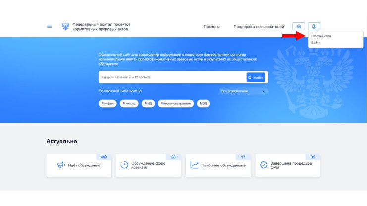 Далее, необходимо зайти на свой «Рабочий стол» в профиле и найти вкладку «Проекты». После этого можно воспользоваться поиском по наименованию проекта нормативного акта или присваемому проекту ID для того, чтобы найти нужный проект.