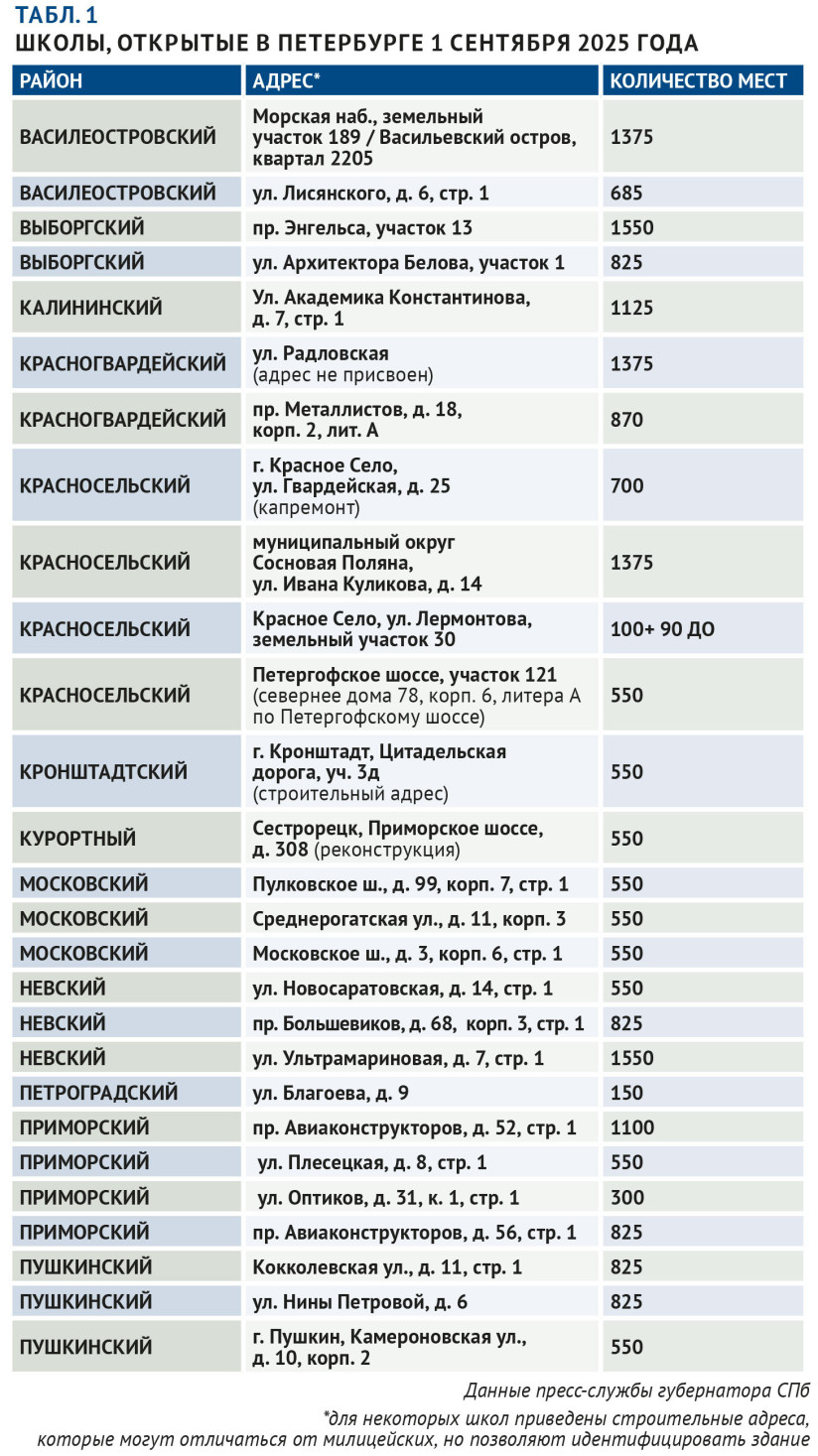 В стартовавшем учебном году в Петербурге появилось 27 новых государственных школ (о частных – отдельно). Суммарно они могут принять немногим более 19 тыс. учеников. Уроки начались в зданиях, введенных в 2024 и 2025 годах. На начало сентября в Петербурге строительные компании ввели 11 школ – участвовали Setl Group, Arsenal, холдинг «РСТИ», ГК «Полис», «Группа ЛСР», «КВС», «Глоракс». А за счет бюджета в 2025-м в городе пока построены 8 учебных заведений.