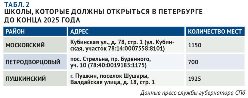 В Пушкинском районе – тоже три учебных заведения (общей вместимостью в 2,2 тыс. ребят). Например, школу на 550 учеников в ЖК «Парадный ансамбль» на Пулковском шоссе построил Setl Group.