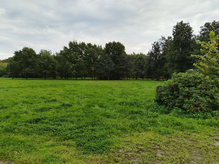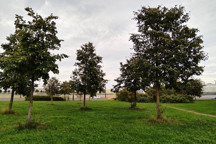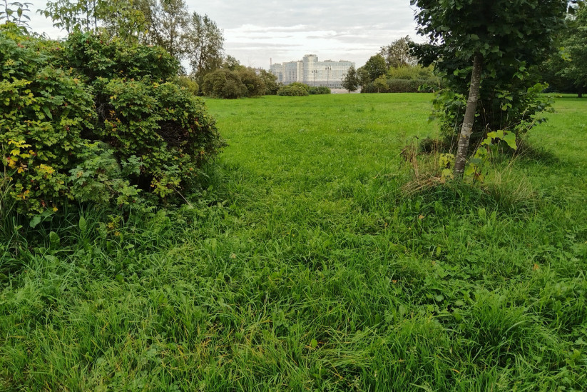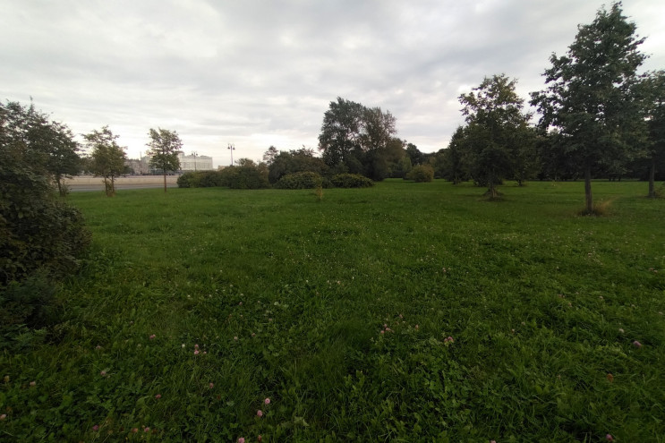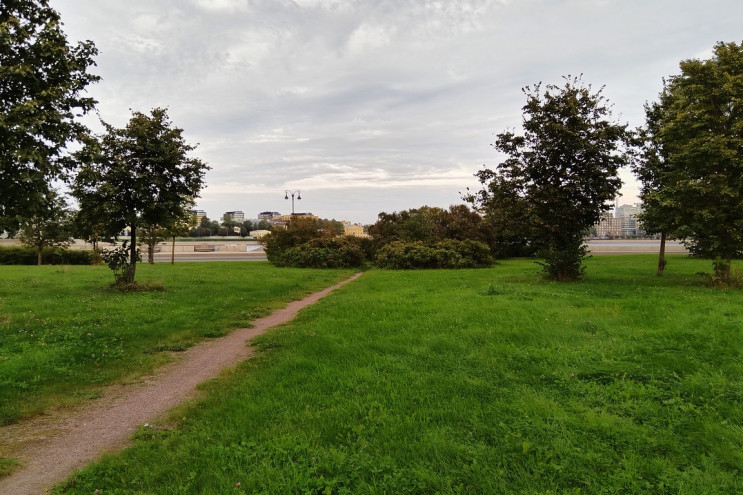 Нестриженные газоны – место для тренировок редких посетителей, а еще – целая поляна для собак. Тут довольно много взрослых деревьев, над верхушками которых можно разглядеть колокольню Смольного собора.