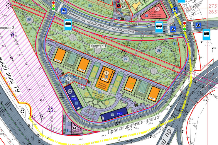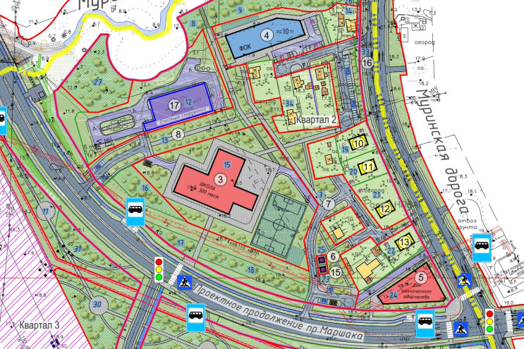 В квартале между Пискаревским проспектом, Муринской дорогой и будущим проспектом Маршака задумана школа на 300 учеников, трехэтажный физкультурный комплекс (5 тыс. кв. м) и дом технического творчества. Там же разместят трансформаторную подстанцию и очистные. Кстати, в материалах, вынесенных на обсуждение, написано, что снос не предполагается — можно предполагать, что тут останутся существующие индивидуальные жилые дома.