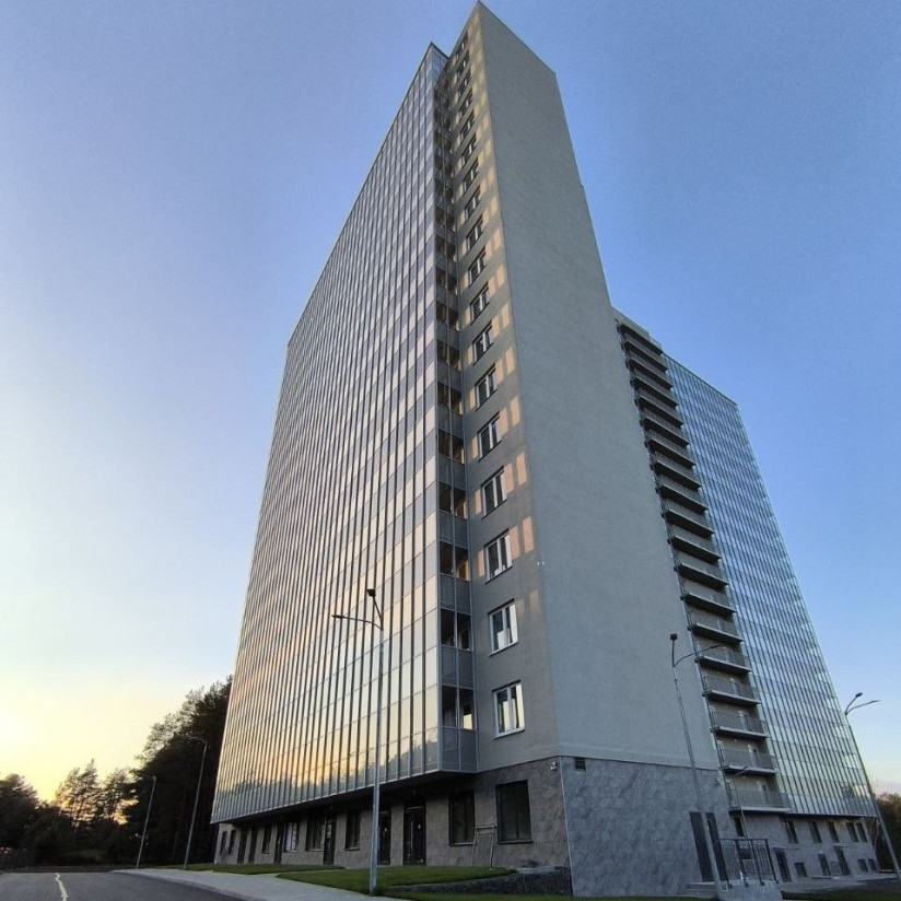 Проект реализован в гп. Кузьмоловский Всеволожского района Ленобласти. Из окон многих квартир открываются живописные виды на лес и парковые зоны. Высота дома – 19 этажей; всего там запроектировано две жилых секции на 352 квартиры общей площадью около 16,4 тыс. кв. м.