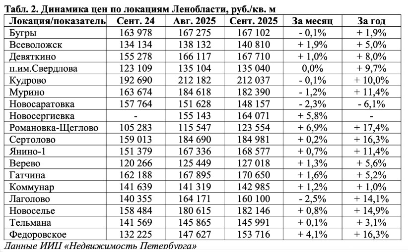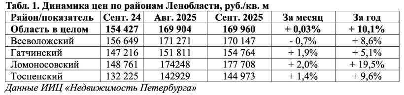 В сентябре 2025 года цены на новостройки Ленинградской области практически не изменились. Текущий уровень составляет 169,96 тыс. рублей за квадратный метр. По росту цен за год область опережает только городские окраины.