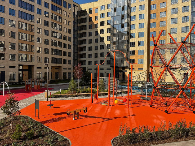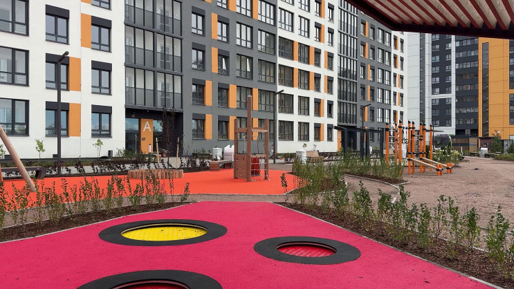 Во дворах уже смонтированы малые архитектурные формы: детское игровое и спортивное оборудование, скамейки, урны готовы к эксплуатации. Уложены рулонные газоны, высажены многолетники и кустарники. Завершилось благоустройство посадкой крупномерных деревьев.