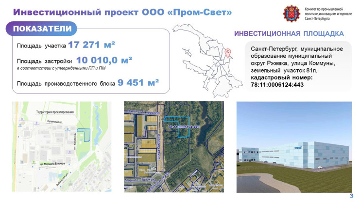 Вторым одобрено строительство завода ООО «Пром-Свет» по выпуску осветительного оборудования. Участок под застройку на Ржевке передан целевым образом по льготной цене. Срок реализации – пять лет. Инвестиции в проект составят порядка 420 млн рублей.