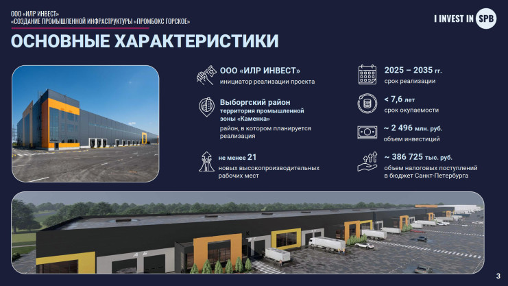 На рабочем совещании губернатора Петербурга одобрены три коммерческих проекта – два новых завода и складской комплекс. ООО «ИЛР Инвест» построит промышленный комплекс из двух корпусов. Там разместится производство аксессуаров и деталей, используемых в автомобилестроении.