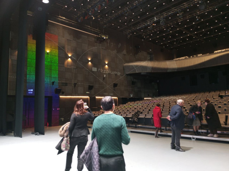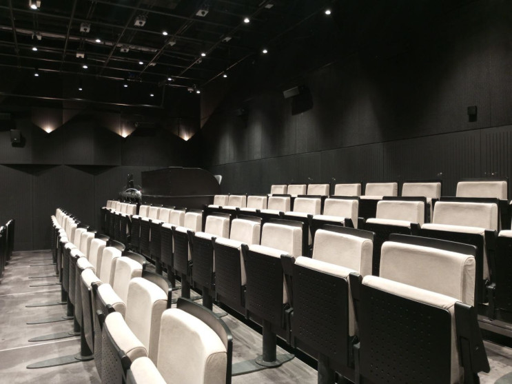 На втором этаже находится зрительский зал с балконом на 1007 мест. В нем установлены штанкеты со световым оборудованием, в том числе с театральными софитами, звуковое оборудование, два проектор – кино- и медиа-, а также два дополнительных навесных экрана. Кресла в зале подвижны, их можно раздвинуть и установить перед ними сцену глубиной в 7 или в 13 метров.