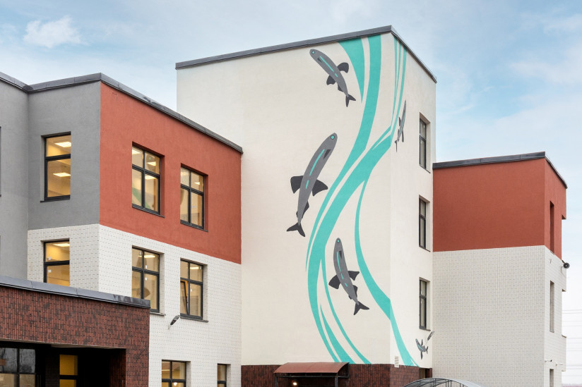 Строительством ДОУ занималась Группа ЦДС. Садик рассчитан на 14 групп, четыре из которых – ясельные. В здании для детей обустроили кружковые помещения, класс для подготовки к школе, а также кабинеты логопеда и психолога, медицинский и пищевой блоки. Фасады садика украшены рисунками с корюшкой — символом Ленинградской области.