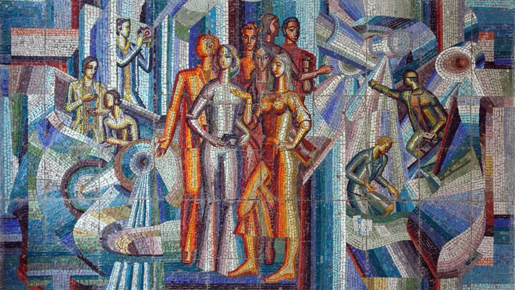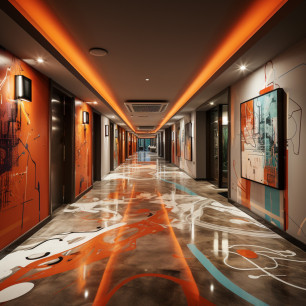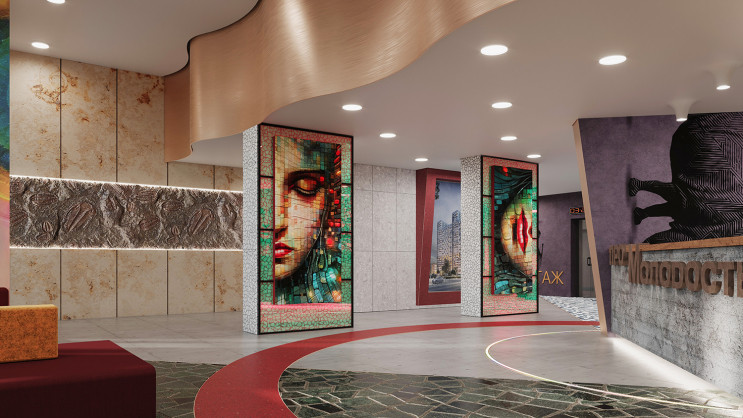 В лобби — панно с палеолитами, которым 450 миллионов лет; мозаика, сделанная по эскизам искусственного интеллекта, но в древнеримской технике; перевернутые носороги. Причем мозаичное панно мы делаем как произведение искусства, которое будет прирастать в цене и станет точкой притяжения для экскурсионных групп, чтобы стоило к нам заехать и посмотреть. В лифтовых холлах во всю высоту до потолка нанесена шкала Модулор Ле Корбюзье. Казалось бы, зачем? В-первых, это транслирует нашу приверженность эргономике, во-вторых, это занимательная возможность для людей узнать новый факт.
