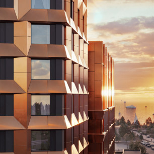водная гладь, прибрежные каменные породы. В материалах — медные оттенки, благородная патина, тона железа и никеля, придающие фасадам самобытность и актуальность.
