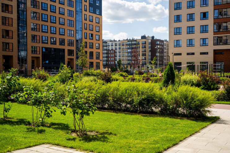 Важнейшим следствием такого планирования становится приватность. Окна квартир в лаунж-квартале УЮТный открывают вид на зеленые аллеи, небо и ландшафтные композиции, а не на стены соседних зданий.