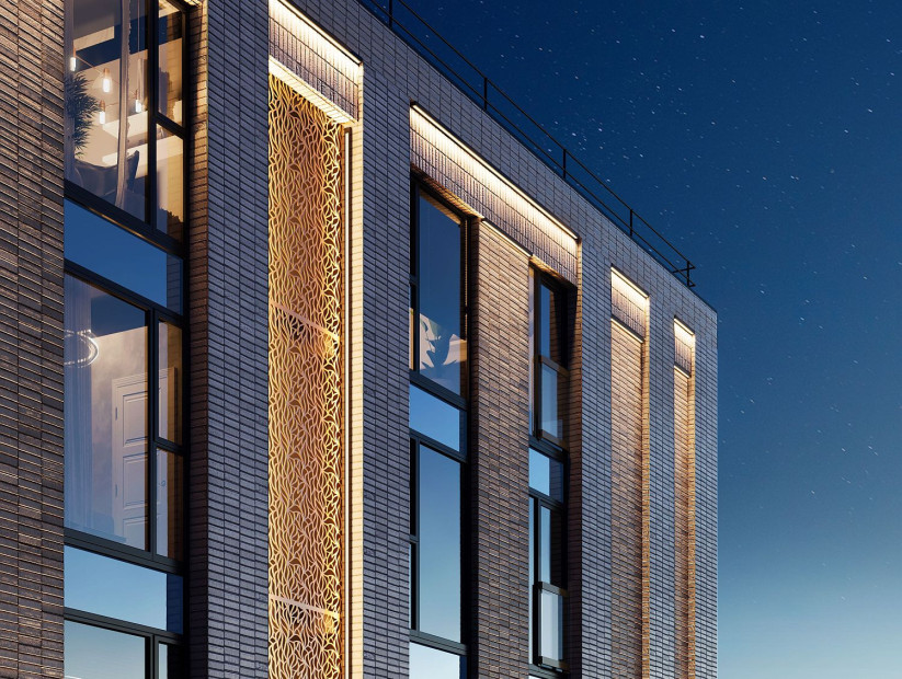 Одной из важных характеристик, оказавших значительное влияние на результат, стал архитектурный облик проекта. Высокий класс жилого квартала отражается даже в отделке фасадов, которая будет выполнен с использованием кирпичных панелей с 3D-эффектом. Элегантные золотые элементы, интегрированные в отделку, закроют шахты для размещения кондиционеров, создавая акценты, отсылающие к концепции проекта.