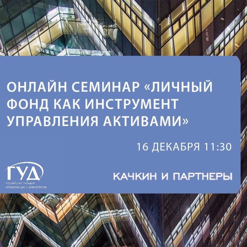 16 декабря в 11:30 адвокатское бюро «Качкин и Партнеры» при поддержке НП РГУД проводит онлайн семинар по личным фондам и их использованию для управления активами