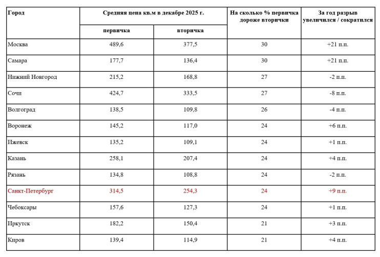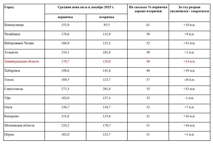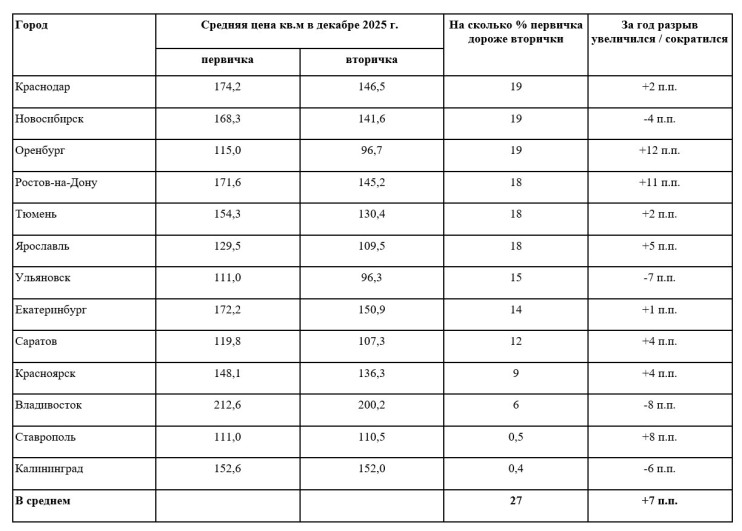 «Опережающие темпы роста цен в новостройках привели к тому, что к концу 2025 года не осталось городов, где цены на вторичке выше первички», — комментирует Елена Бобровская, ведущий аналитик «Циана». Она считает, что в 2026 году динамика сохранится.