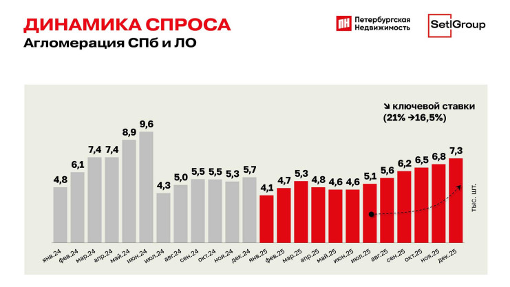 Что повлияло на результат 2025 года? Прежде всего — снижение ключевой ставки Центробанка, которая с июня уменьшилась с 21% до 16,5%. Еще один важный фактор: с 1 февраля мы все ждем ограничений по программе «Семейной ипотеки», которая является главным двигателем ипотечных сделок.