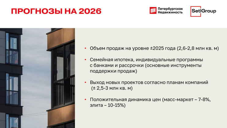 — Начну с того, чем мы заканчиваем год: продажи по итогам 2025-го, по нашим оценкам, составят в петербургской агломерации 2,7 млн кв. м (и это соответствует нашим прогнозам годичной давности), предложение — 3,4 млн, вывод новых проектов за год — 3,3 млн.