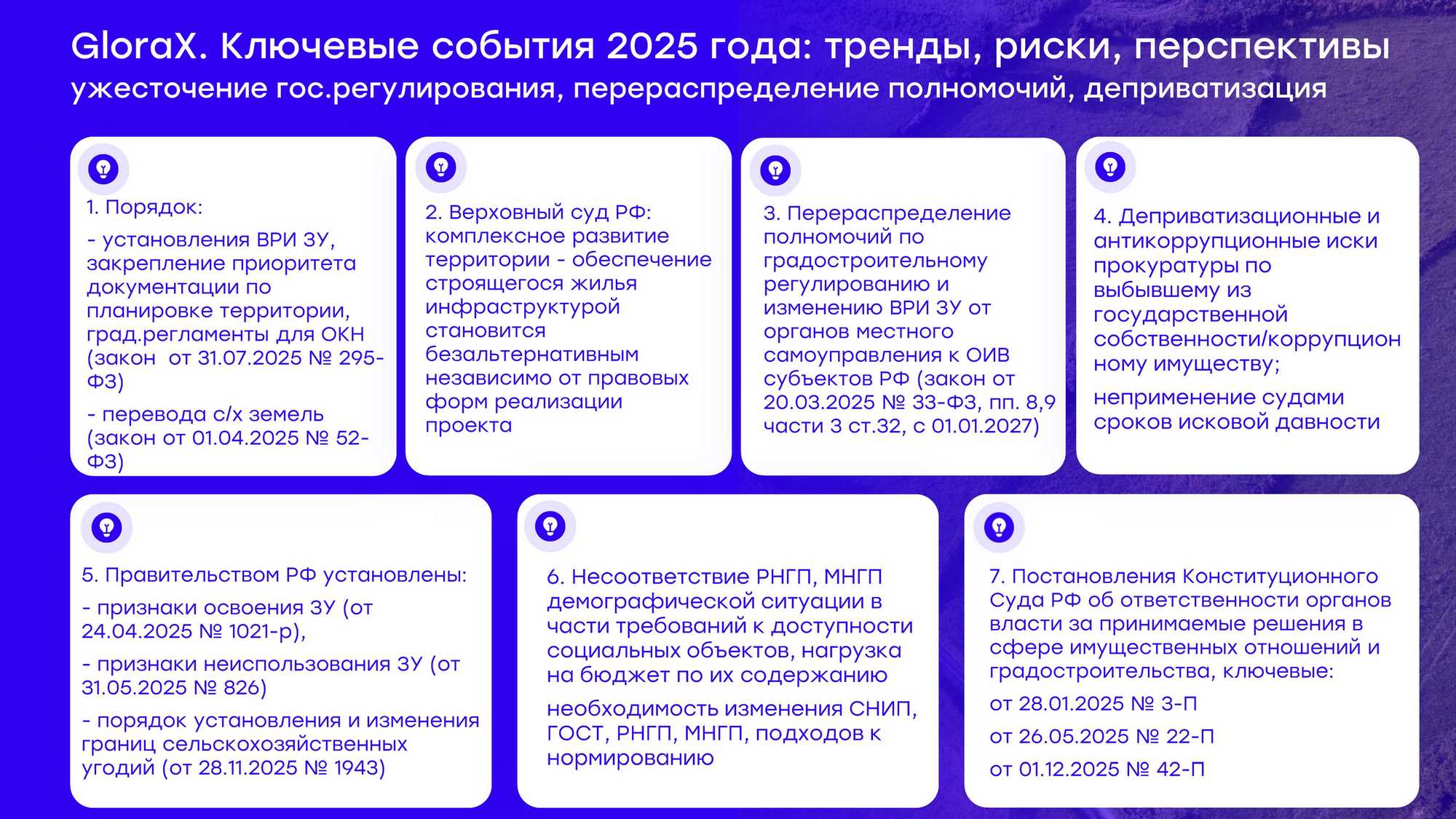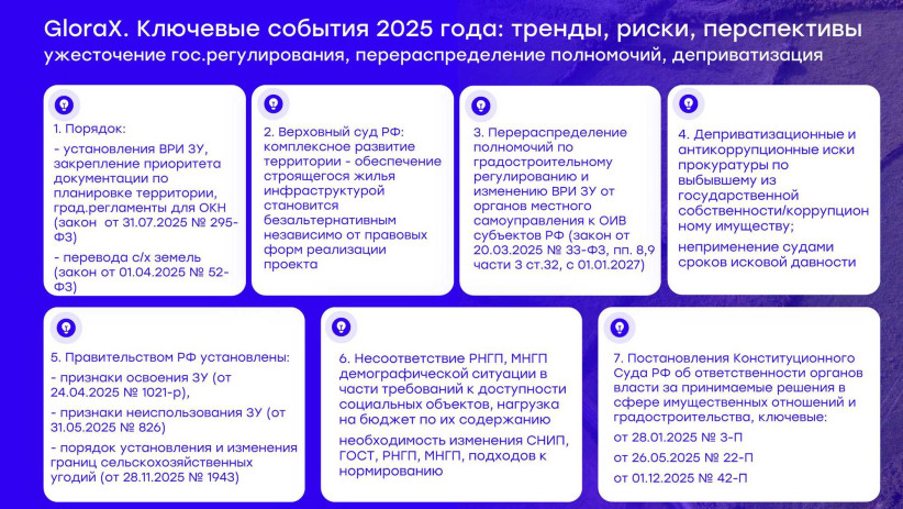 Еще одно важное событие на эту же тему. В 2025-м принят закон, который усложняет процедуру перевода сельскохозяйственных земель в другие категории. А 28 ноября правительство утвердило постановление о порядке изменения границ сельскохозяйственных угодий. Это напрямую влияет на рынок земли в Ленинградской области. Как мы знаем, сейчас любые проекты, связанные с сельхозземлями, фактически приостановлены. И это нужно иметь в виду.
