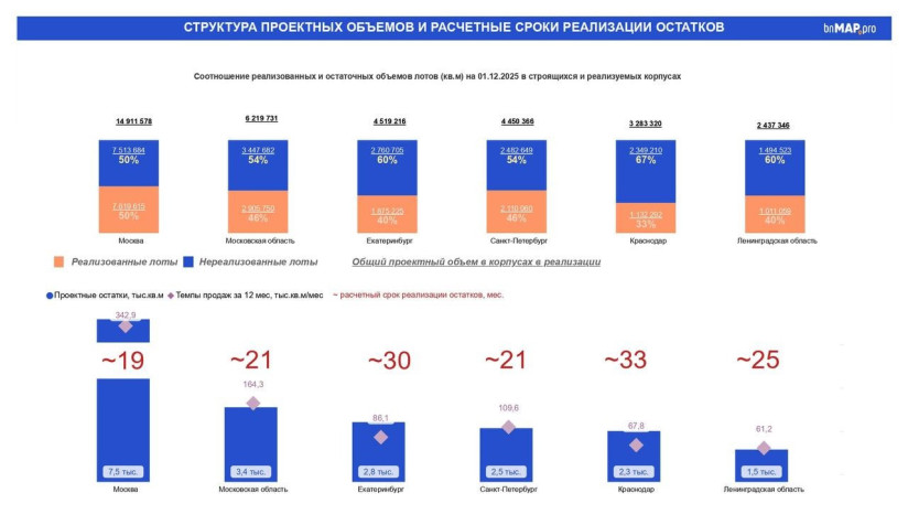 В Петербурге объем составляет 1,5 млн кв. м — 32 861 лот (квартиры и апартаменты), в Москве 3,2 млн (53 140 лотов), в Краснодаре — 2,6 млн (51 268), в Ростове-на-Дону — 1,6 млн (32 950).