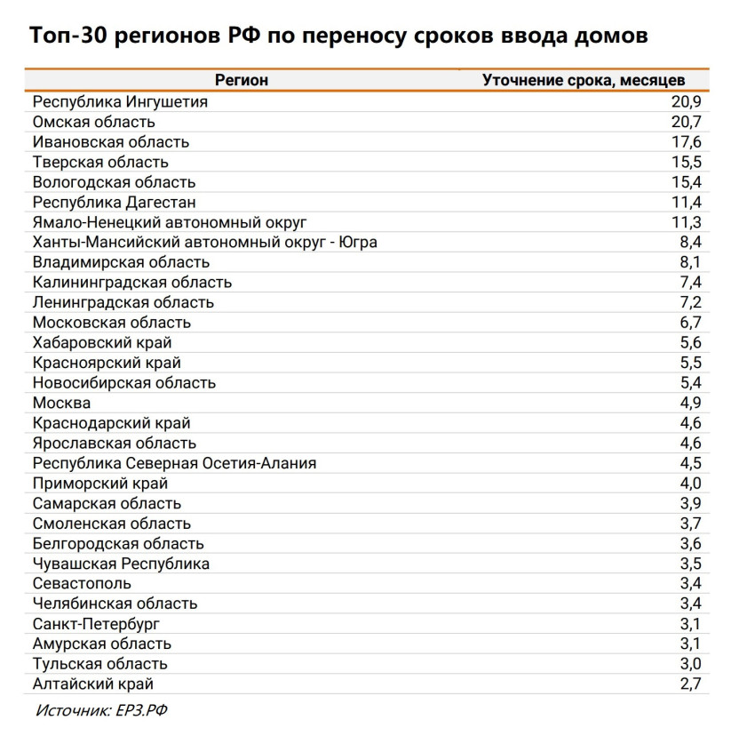 Самые серьезные задержки сдачи новостроек — в Ингушетии (20,9 месяца), Омской (20,7) и Ивановской (17,6) областях.