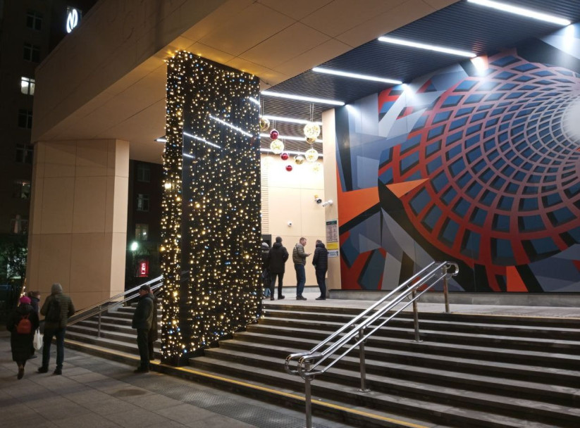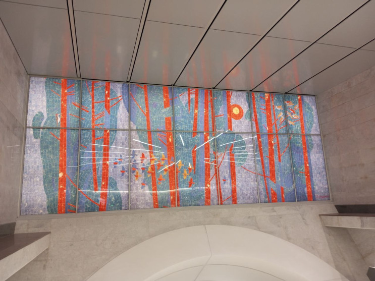Для распределения пассажиропотока установлено 20 турникетов. Там работает четыре эскалатора, а над наклонным ходом установлено стеклянное панно площадью более 45 кв. метров на тему северной природы ближайших окрестностей Петербурга.