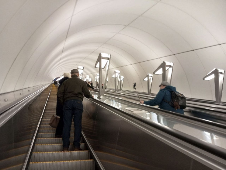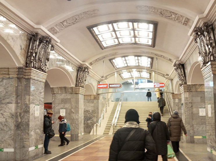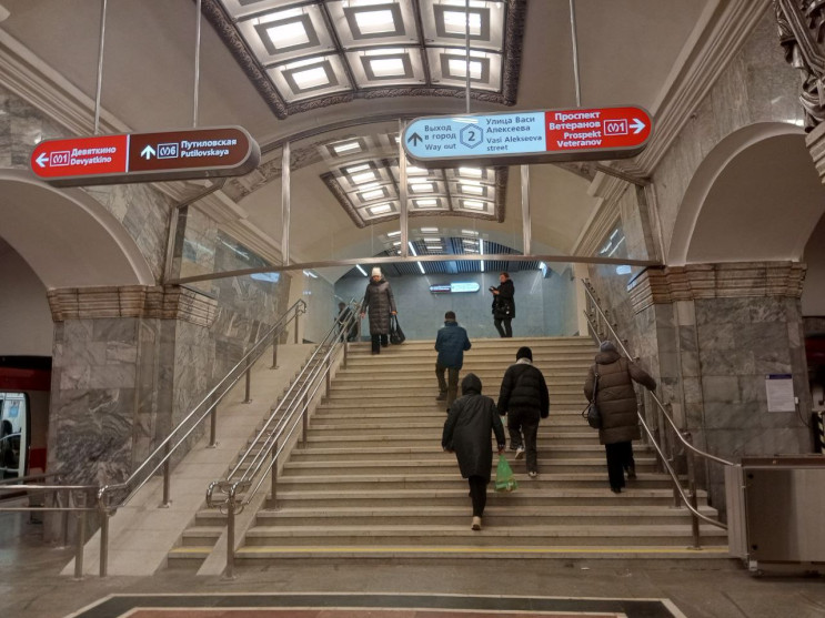 ‎На станции действует четыре эскалатора. Установлено 16 турникетов – по восемь на вход и выход. Над наклонным ходом тоже расположено панно, изображающее историю Путиловского завода.
