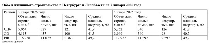 По данным на 7 января 2026 года в Петербурге и Ленобласти строится 9,177 млн кв. м жилья, что сопоставимо с уровнем января 2025 года: 9,231 млн «квадратов». При этом в Петербурге строительный объем за год сократился на 3,76%, а в Ленобласти — почти на столько же вырос (+3,63%).