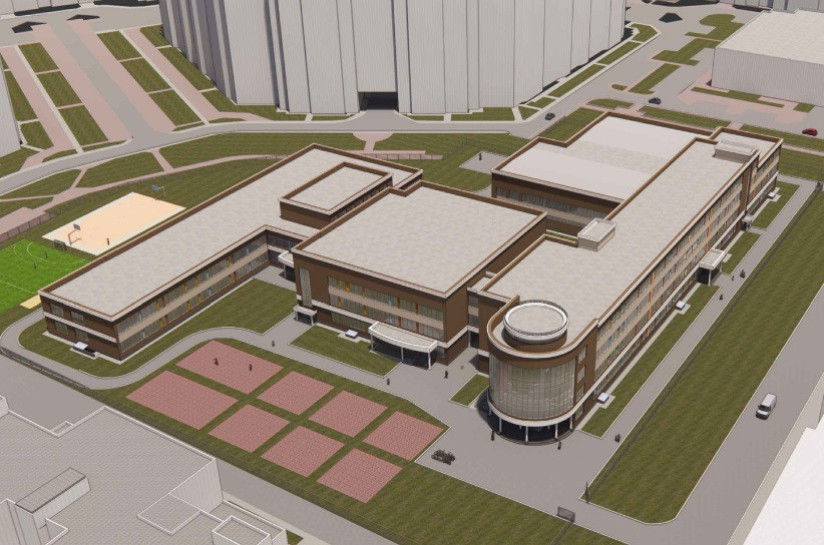 Внутри обустроят учебные классы, столовую, медкабинеты, бассейн, актовый зал и спортивные залы. Во дворе разместят игровые и спортивные площадки. Фасады здания выполнят в светло-серого, терракотового и рубинового оттенках.
