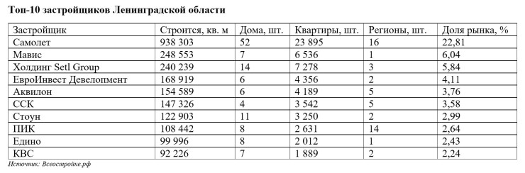 На трех ведущих застройщиков Петербурга приходится 36,4% площади всего возводимого в регионе жилья. В Ленинградской области свой расклад, и там перечень возглавляют ГК «Самолет», «Мавис» и тот же Setl Group. На эту тройку приходится 34,69% от общего объема новостроек.