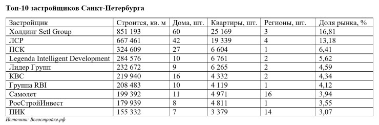 Больше трети всего объема жилья в Петербурге строят три девелопера: Setl Group, «Группа ЛСР» и ПСК