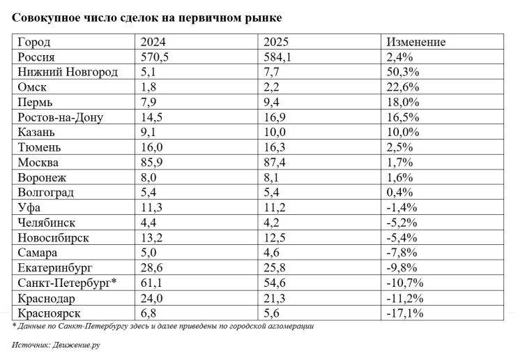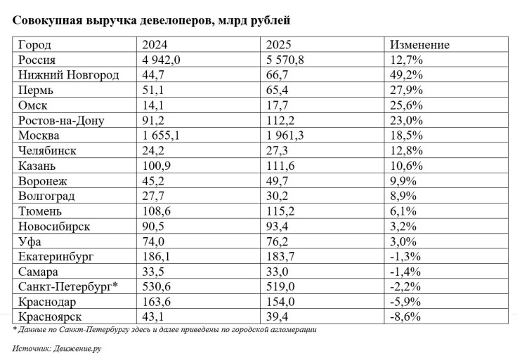 Повышение спроса на новостройки отмечено по всей России: эксперты портала «Движение.ру» называют прошлогоднюю выручку рекордной за всю историю наблюдения — 5,57 трлн рублей против 4,94 трлн в 2024-м и 5,25 трлн в 2023-м.