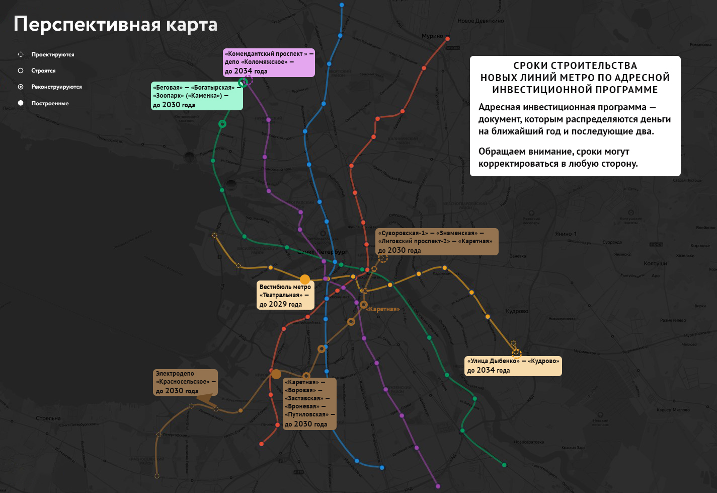 В конце прошлого года была утверждена Адресная инвестиционная программа (с объектным перечнем бюджетных строек). Ниже на карте можно посмотреть актуальные сроки строительства станций метрополитена.