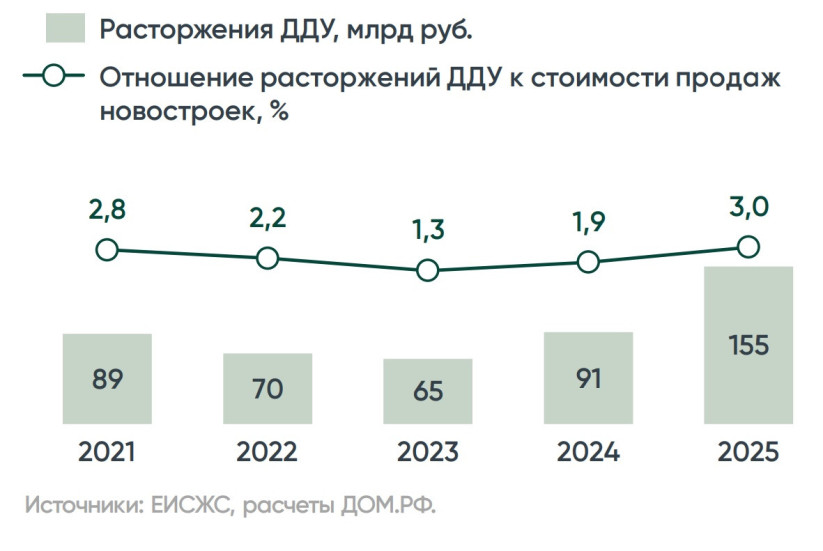В 2025 году было расторгнуто 3% договоров долевого участия (ДДУ) — 14,2 тыс. сделок с квартирами в новостройках в целом на 155 млрд рублей, следует из статистики Дом.РФ. Это максимум за пять лет и в 1,7 раза выше предыдущего рекорда: 91 млрд рублей в 2024 года.