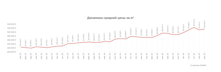 Средние площади в сделках также уменьшались: 41,2 кв. м в 2023 году, 39,4 кв. м в 2024-м и 38,6 кв. м в 2025 году. При этом средняя цена за три полных года, с января 2023-го по декабрь 2025 года, в Петербурге выросла на 41% – с 224 тыс. до 316 тыс. рублей за кв. метр.