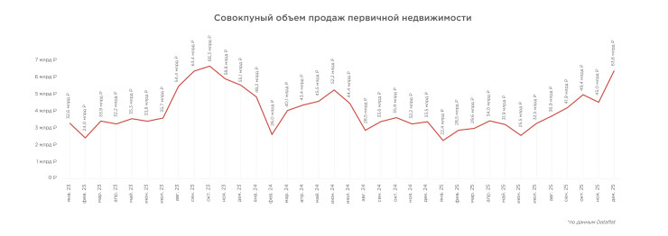 Финансово наиболее успешным для рынка за этот период стал октябрь 2023 года с совокупными продажами в 66,3 млрд руб. При этом, несмотря на общие тенденции, декабрь 2025-го почти повторил рекордный финансовый результат двухлетней давности – общие продажи на рынке первичной недвижимости Петербурга достигли 63,6 млрд руб.