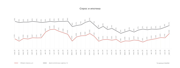 Несмотря на кажущуюся прямую связь, спрос и ипотека не всегда коррелировали в течение последних трех лет. С января 2023-го по январь 2024 год доля ипотечных сделок стабильно варьировалась на уровне 80-86%. Кривая спроса, при этом, колебалась в значениях от 2,6 тыс. до 6,8 тыс. сделок в месяц.