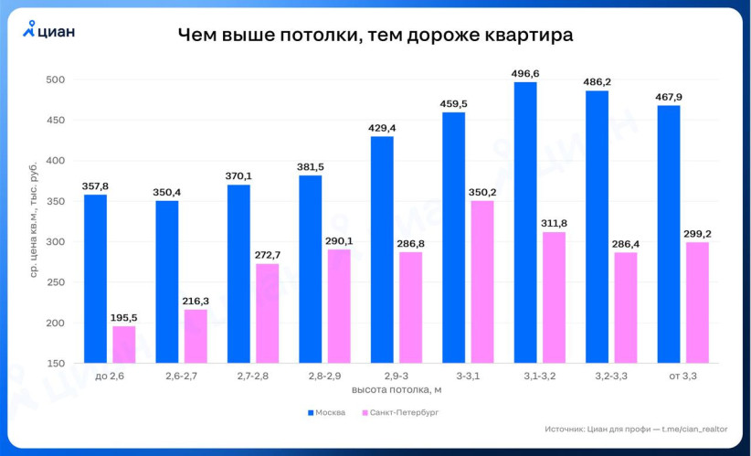 Не все эксперты усматривают настолько прямую зависимость между высотой потолков и ценой недвижимости, однако очевидно, что просторные квартиры с высокими потолками — это более дорогое жилье, чем стандартный эконом-класс. Специалисты компании «Метриум» отмечали в комментарии ресурсу IRN, что в высокобюджетном сегменте высота жилого помещения может стать уникальным конкурентным преимуществом и существенно повлиять на ценообразование.