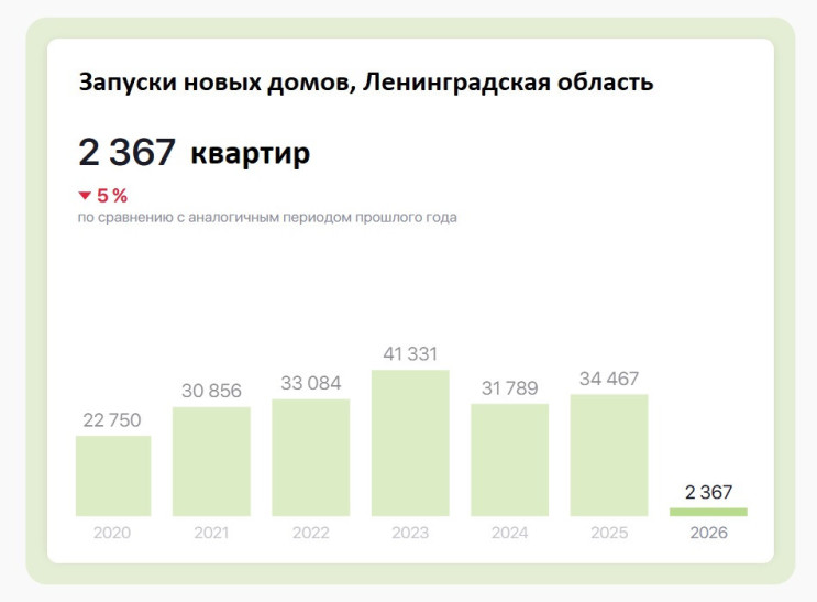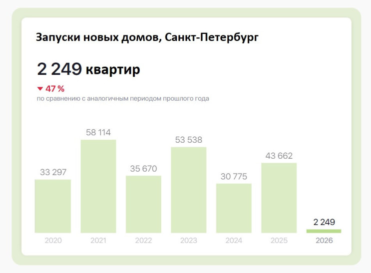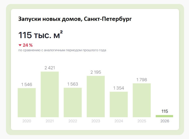 У других аналитиков данные несколько отличаются, но тоже подтверждают тренд. Так, эксперты Центра аналитики BN говорят, что в прошлом году в Петербурге в продажу вышло на 32% больше недвижимости по площади, чем в позапрошлом. А сервис bnMAP подтверждает, что в январе 2026-го город вдвое сбавил обороты по запуску жилых проектов против уровня 2025-го.