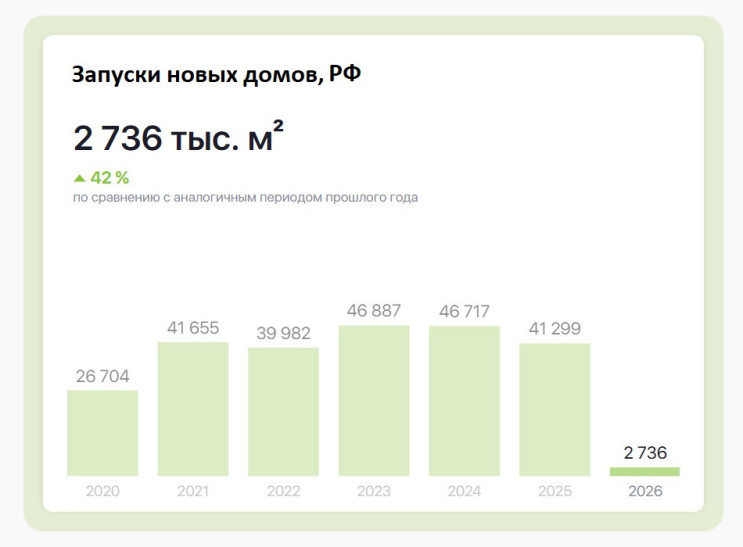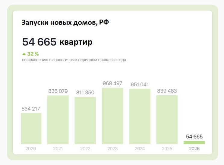 Интересно, что результаты по России в целом обратные: в прошлом году активность девелоперов в смысле новых проектов замедлилась (минус 12% и по числу квартир, и по совокупной площади новых проектов), а в январе 2026-го — ускорилась (+32% и +42% соответственно).