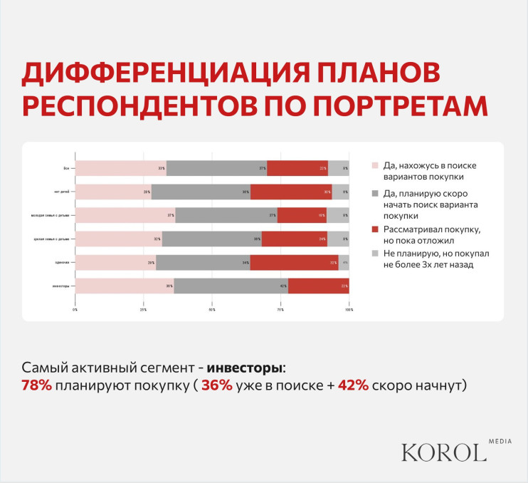Из всех респондентов 33% в данный момент находятся в поиске квартиры, 37% планируют его вскоре начать, 22% собирались, но пока отложили покупку, а остальные 8% приобрели жилье в течение последних трех лет.