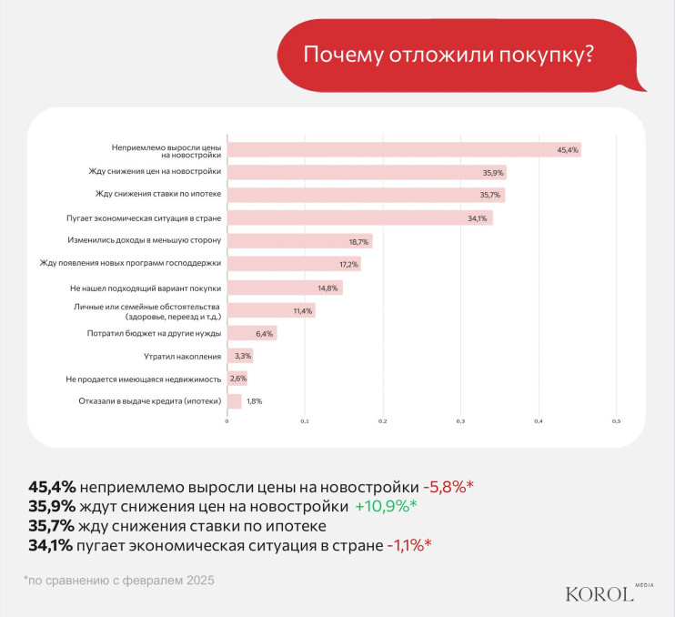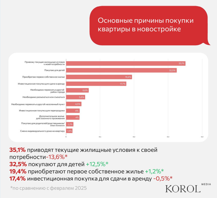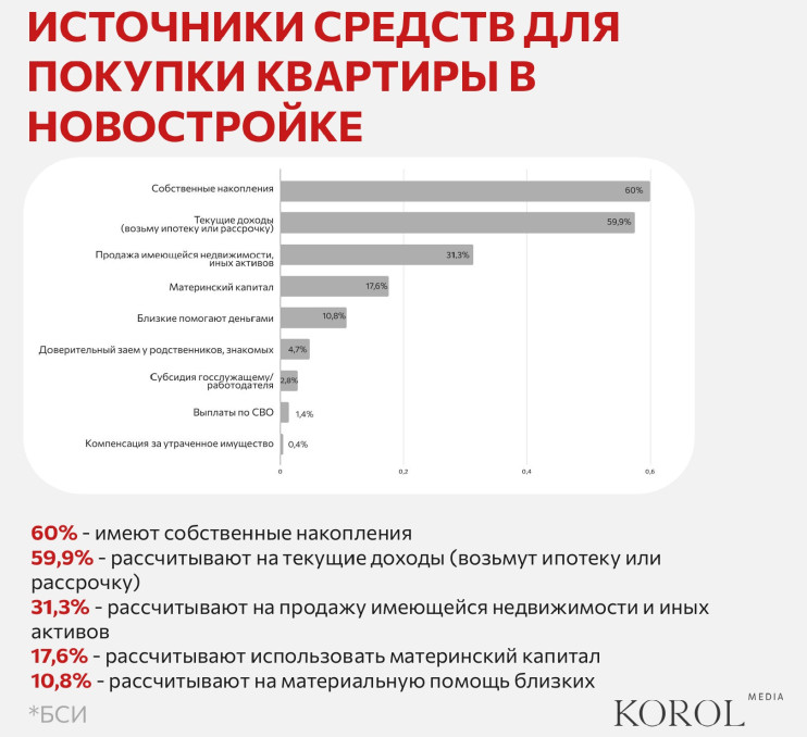 Такие выводы можно сделать из материалов совместного масштабного исследования поведения покупателей новостроек «Без ипотеки 3.0», которое провели эксперты маркетингового агентства Korol Media и ЕРЗ.РФ. В феврале 2026 года они опросили 2500 респондентов в 27 городах России, выясняя их предпочтения в отношении жилья на первичном рынке.