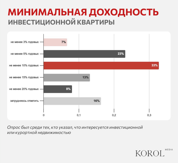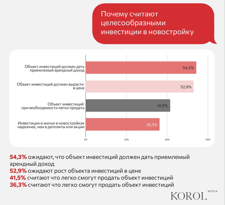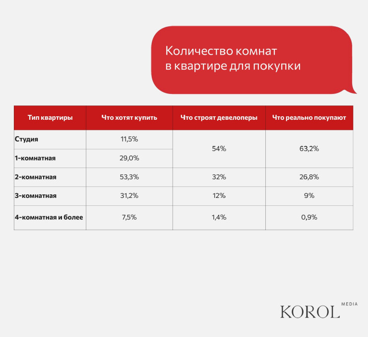 Почти все покупатели новостроек (92%) хотели бы приобрести двух-четырехкомнатные квартиры, а покупают однушки и студии. У инвесторов тоже ожидания расходятся с реальностью: 54% из них рассчитывают на доходность выше 10%, но реальный показатель — 5-7%.