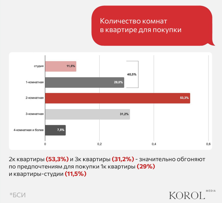 Интересно, что только 40,5% респондентов заявили, что намерены купить студию или однокомнатную квартиру. В реальности же жилье такого формата приобретают 63,2% покупателей. Предложение не совпадает со спросом: из представленных на рынке лотов, по данным авторов исследования, только 54% занимают студии и однушки.