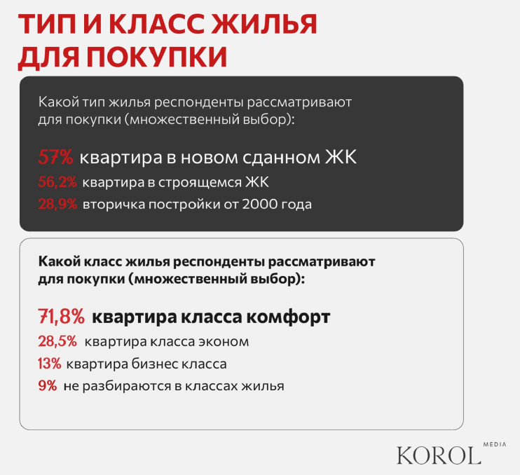 Большинство граждан интересуются только новыми домами: 56,2% готовы купить квартиру в строящемся ЖК, 57% — в только что сданном. Вторичка, даже новая, сформировавшаяся после 2000 года, привлекает только 28,9%.