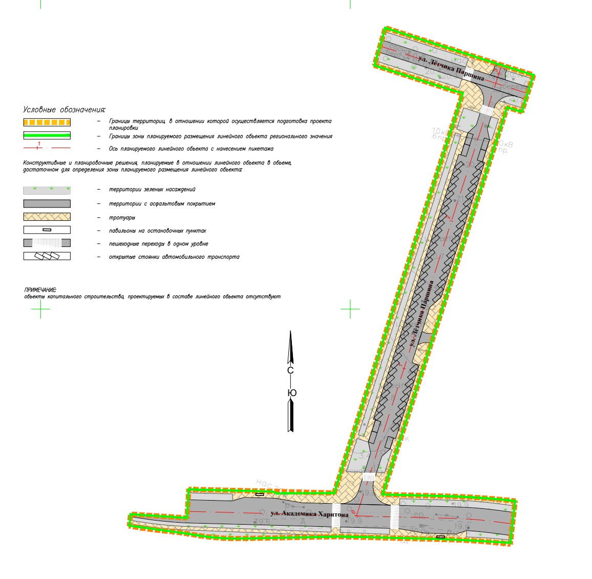 Дорога будет разделена на две полосы, с парковками и тротуарами. Пропускная способность — 1,1 тыс. автомобилей в час. Улица Академика Харитона, судя по проекту планировки, тоже будет реконструирована: там добавятся карманы для остановок общественного транспорта.