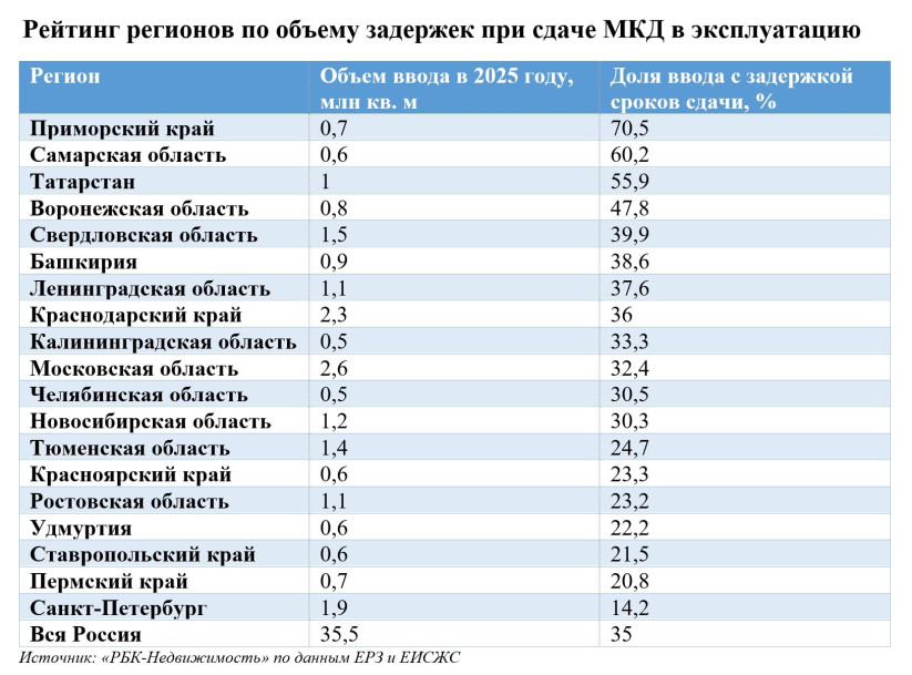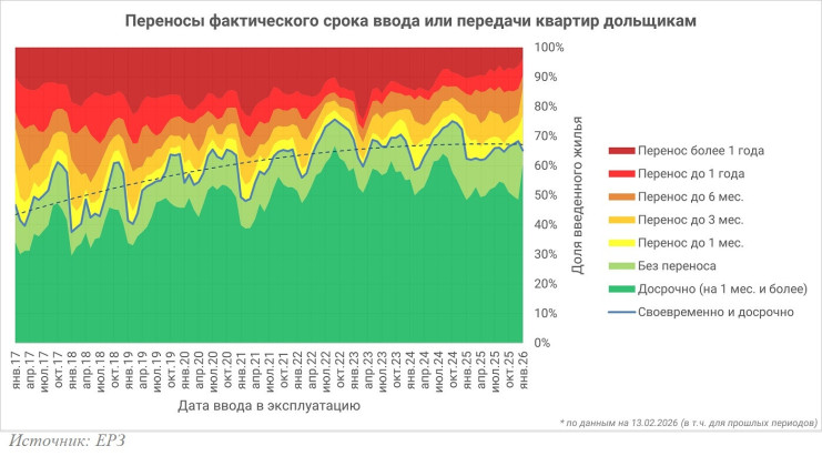 Доля жилья, сданного с задержками, по итогам 2025 года составила 35%. Средний срок переноса ввода — 14,3 месяца.