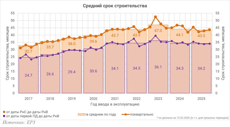 «По состоянию на январь 2026 года средний перенос планируемых сроков ввода в эксплуатацию строящихся объектов составляет 3,4 месяца, а с учетом объектов, строительство которых остановлено, — 5,2 месяца», — говорится в публикации ЕРЗ.