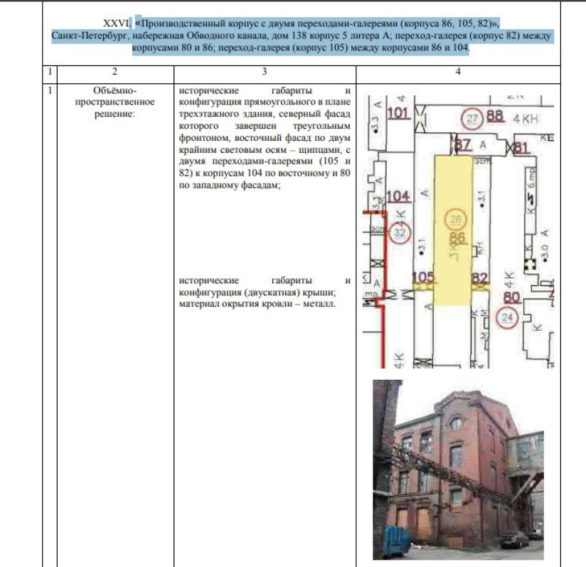 Историко-культурная экспертиза согласовала проектную документацию для работ по сохранению одного из производственных корпусов на территории бывшего завода «Красный треугольник»: речь о постройках с двумя переходами-галереями на наб. Обводного канала, 138, корп. 5, литера А (корпуса 82, 86 и 105) 1914 года постройки.