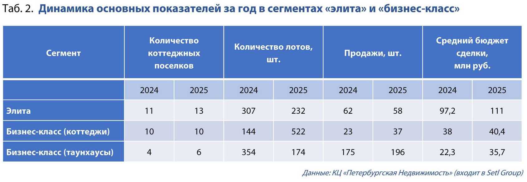 По данным КЦ «Петербургская Недвижимость», за прошлый год реализовано 58 лотов в элитном сегменте (на 4 единицы меньше); в бизнес-классе – 233 лота (годом ранее – 198), включая таунхаусы. Средние цены во всех сегментах за год немного подросли (подробнее – см. таб. 2)