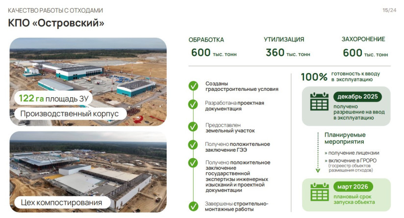 Комплекс по переработке отходов «Островский» должен открыться в марте 2026 года
